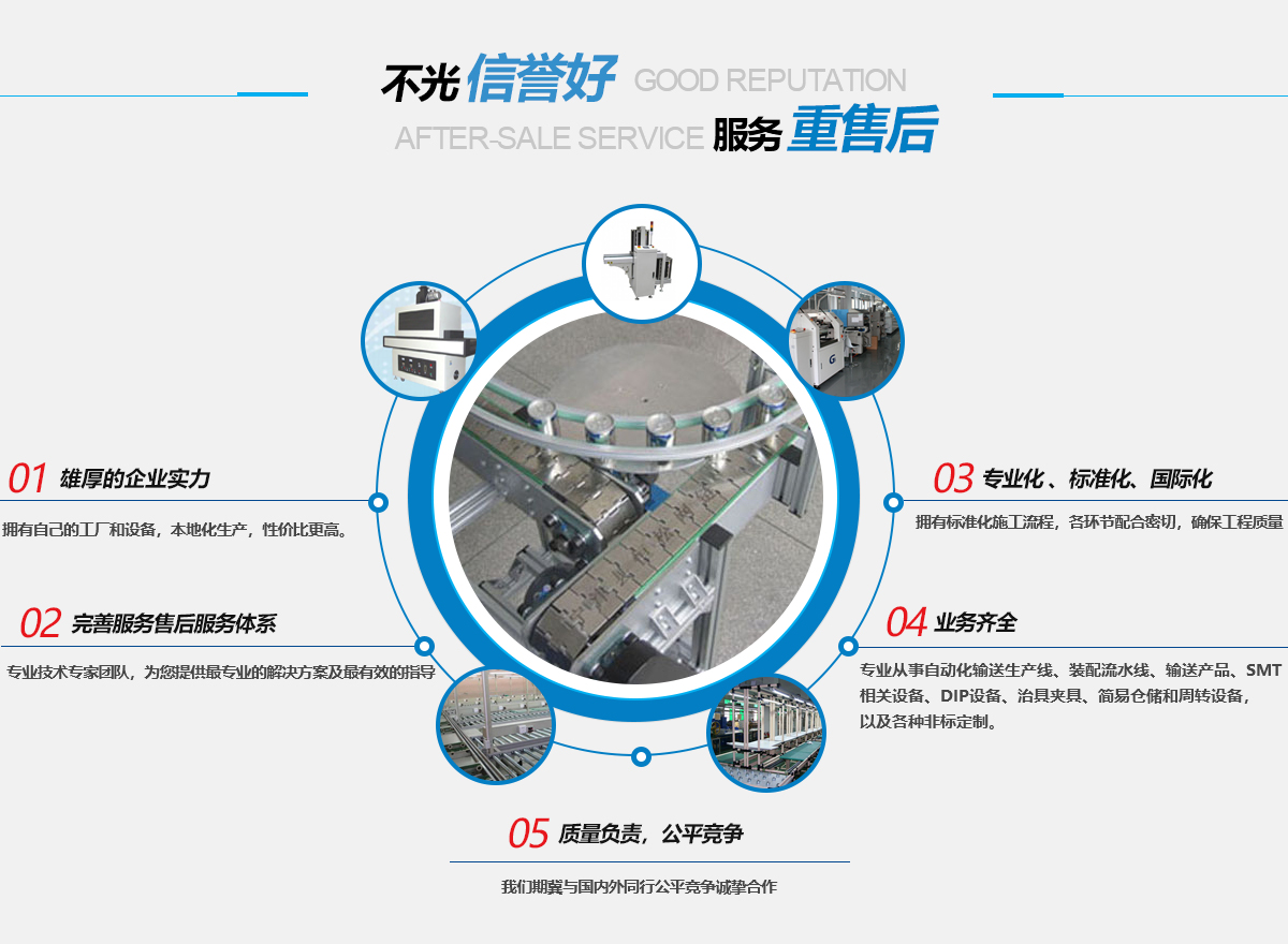 我公司致力于電子、工業新技術推動的新產品工藝的設備配套,專業從事自動化輸送生產線、裝配流水線、輸送產品、SMT相關設備、DIP設備、治具夾具、簡易倉儲和周轉設備,以及各種非標定制.....